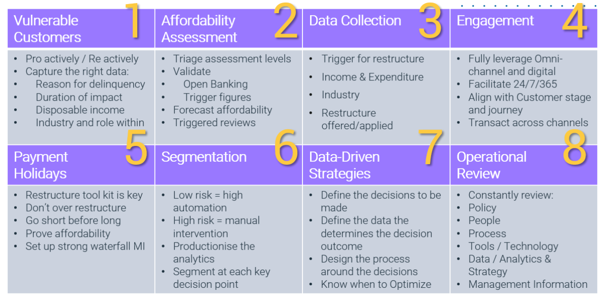 - Long-Term Strategic - Day 180+: Multiple touch points with the customer will be required to validate their financial/personal wellbeing. Understanding the reasons for payment holiday/forbearance will be critical for regulatory reporting.