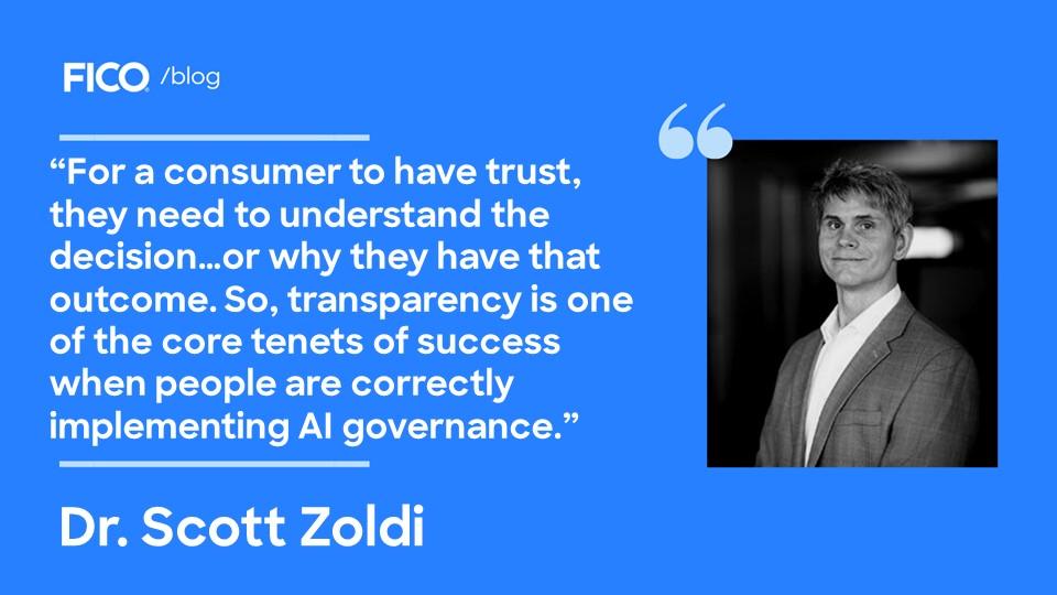 Scott: That is great, Cortnie. When we explore how to establish trust, transparency is key. For a consumer to have trust, they need to understand the decision, and also to have an understanding of how to improve an outcome, or why they have that outcome. So, transparency is one of the core tenets of success when people are correctly implementing AI governance.