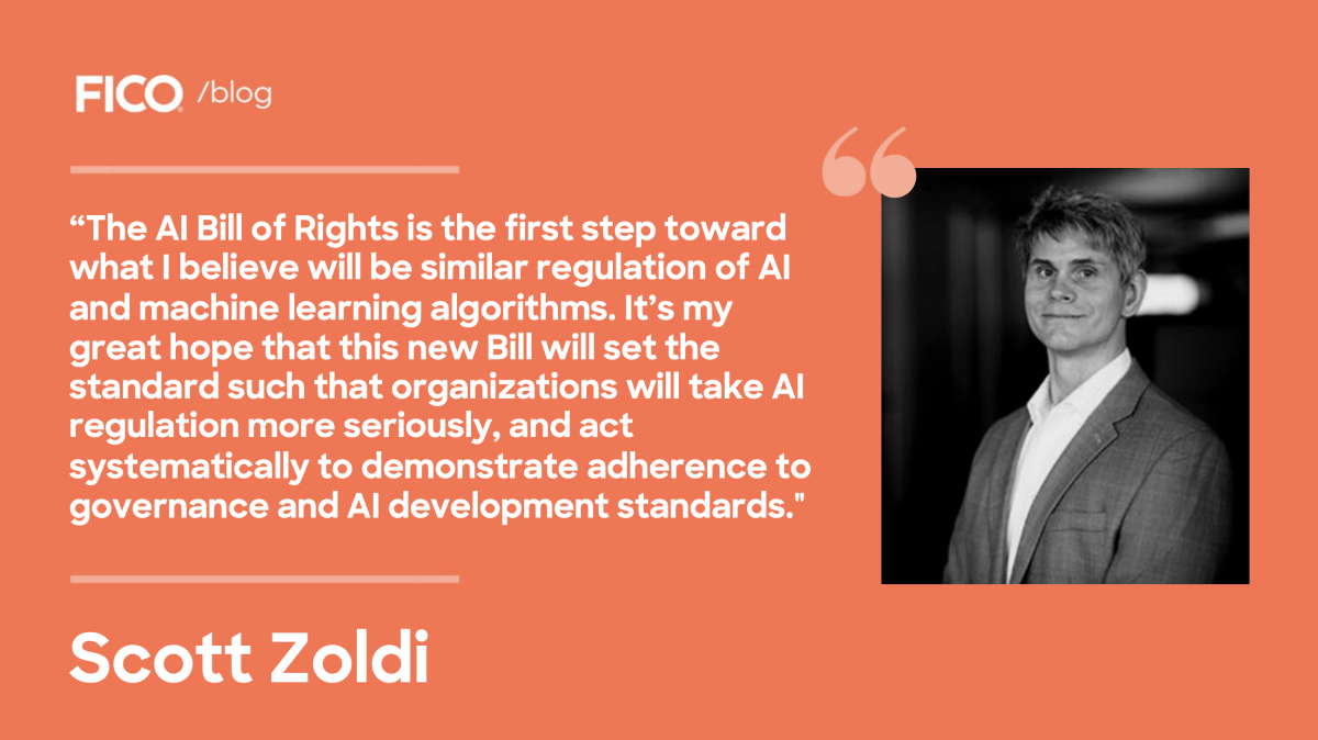 The march toward AI regulation in the United States, now kicked off with the AI Bill of Rights, is a familiar pattern. In FICO’s earlier days, we pioneered the use of scorecard analytic technology to model credit risk. Passage of the Fair Credit Reporting Act in 1970 dictated that algorithms used for this purpose must be accurate, fair, and transparent to data used, ushering in stringent regulation and strong consumer rights.