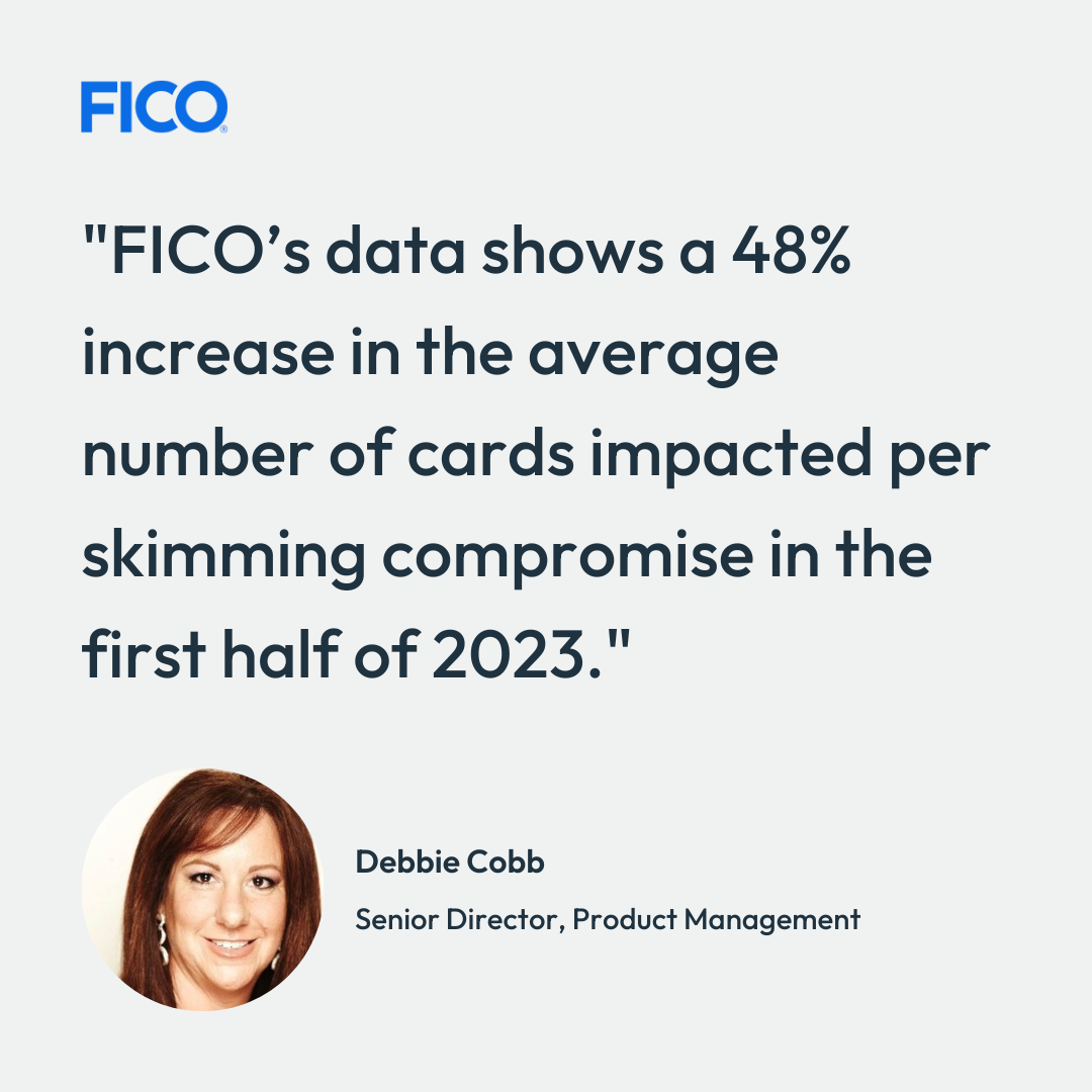 This growth in total cards compromised, despite a smaller increase in compromise events, indicates that criminals are stealing more card details per compromise event. FICO’s data supports this trend, which shows a 48% increase in the average number of cards impacted per compromise in the first half of 2023.