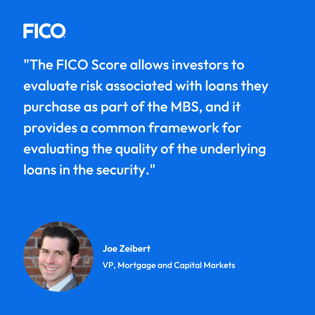 A universal standard credit evaluation process used across time and lenders allows investors to know they are comparing apples to apples, which is critical for the functioning of the secondary market. The FICO® Score allows investors to evaluate risk associated with loans they purchase as part of the MBS, and it provides a common framework for evaluating the quality of the underlying loans in the security. In short, the more predictive and reliable the credit score as a standard of creditworthiness is over time, the easier it is for investors to have faith that their investments will produce the anticipated cashflows. This, in turn, increases the overall value of the MBS as an investment instrument.