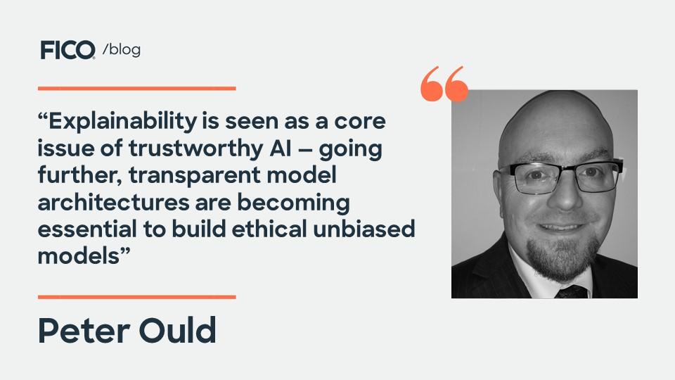 Trustworthy AI has been a concern for FICO for a number of years. With increased computing power allowing data scientists to process more data in a rapid analytic development environment, the potential to introduce bias into models has increased exponentially. The capacity for error exists all the way through the AI process, whether it’s errors or bias in the original sample used for the model, too naïve a reliance on automated machine learning model production (without the necessary experienced oversight and consideration of results) or an inadequate execution framework that compromises the decision made by the AI system. The need to ensure that an AI-driven decision is ethical and responsible has never been greater, and should involve even such aspects as:
