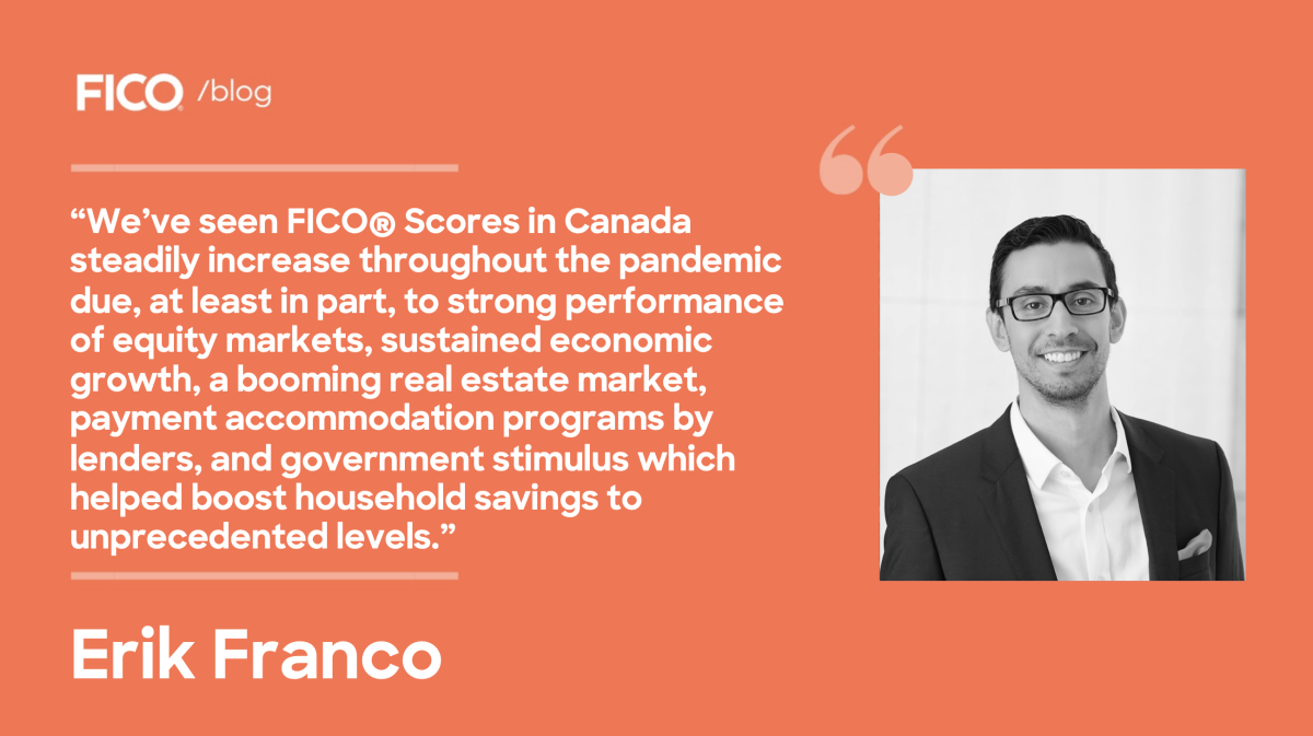 We’ve seen FICO® Scores in Canada steadily increase throughout the pandemic due, at least in part, to strong performance of equity markets, sustained economic growth, a booming real estate market, payment accommodation programs by lenders, and government stimulus which helped boost household savings to unprecedented levels. The relationship between interest rates and consumer credit health is an important one to keep an eye on as interest rates once again rise as part of global efforts to curb rapidly rising inflation.