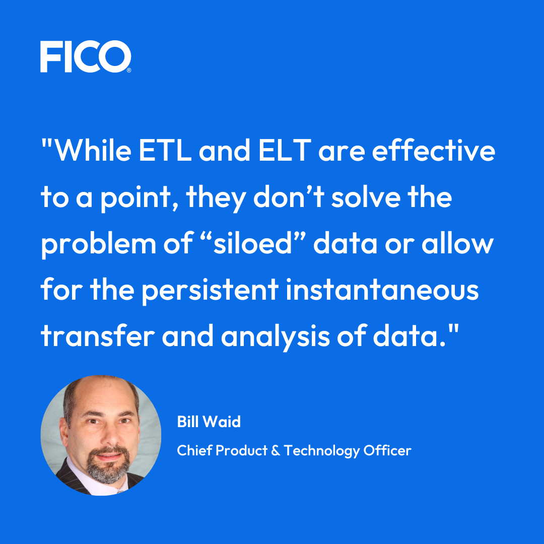 From the outset, this requires a massive data integration effort. For years, the most common approaches to data integration have been digital technologies like ETL (Extract, Transform, and Load) and ELT (Extract, Load, and Transform). While these were once new technologies and effective to a point, they don’t solve the problem of “siloed” data or allow for the persistent instantaneous transfer and analysis of data in a manner needed to enable real-time decisions and actions.