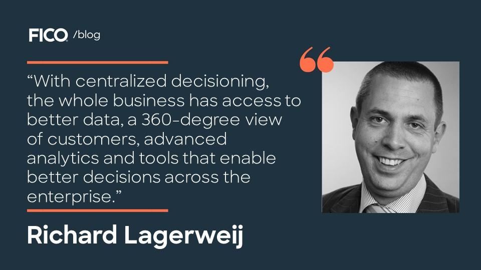 Whatever your goals, a decision management platform gives you the opportunity to pursue centralized decisioning. This doesn't mean all decisions are made in a single control center. It does mean that the whole business has access to better data, a 360-degree view of customers, advanced analytics and shared decision strategy tools that enable better decisions across the enterprise.