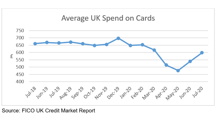 After the dramatic fall in average spending on UK credit cards for January to May 2020 (down 27 percent year on year), spending in June started to increase, up 13 percent on May and by a further 11 percent in July to £598.
