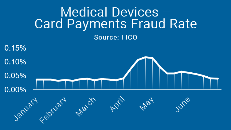 Widespread US closures and quarantines in the US during late March and early April were accompanied by a nearly 200% increase in the fraud rate on medical equipment card transactions occurred during April, the height of quarantine, as compared to baseline rates. Fraud rates remained high through May, and eventually returned to near-normal levels in June. These numbers provide an indication of just how much fraudsters took advantage of the changing consumer spending behaviors early in the pandemic.