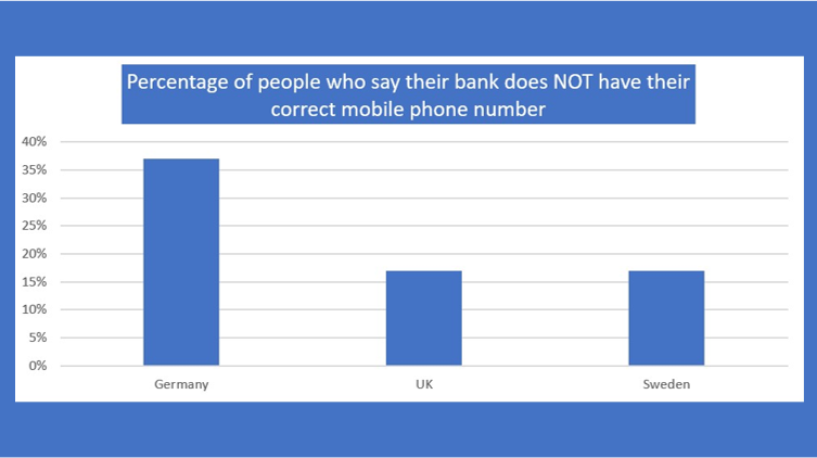 The figures for Germany are particularly concerning, with well over a third saying they haven’t given their bank their current mobile number. While in the UK and Sweden, having the relevant contact data for 83% of your customers may seem reasonably good, if this translates into a failure rate of 17% for e-commerce transactions then it will not be considered acceptable by merchants or their customers.