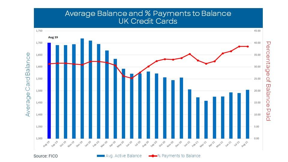 The average spend on UK credit cards increased £23 to £711 in August 2021. This is the highest level since FICO started compiling the data eight years ago. For the third consecutive month pre-pandemic levels were exceeded, up £40 on August 2019.