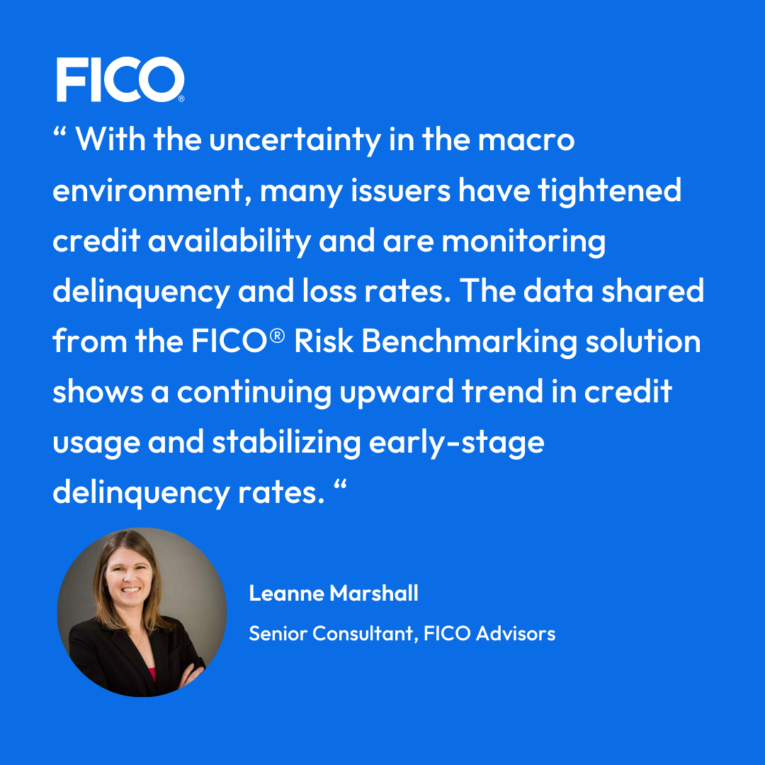 With the uncertainty in the macro environment, many issuers have tightened credit availability and are monitoring delinquency and loss rates. The data shared below from the FICO® Risk Benchmarking solution shows a continuing upward trend in credit usage and stabilizing early-stage delinquency rates. We’ll dig further into credit card trends that represent a national sample of approximately 130 million US accounts gathered from FICO client reports generated by FICO® TRIAD® Customer Manager and Adaptive Control System solutions.