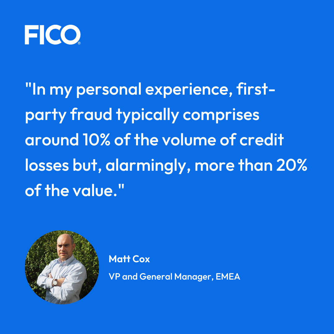 In my personal experience, first-party fraud typically comprises around 10% of the volume of credit losses (also known as bad debt) but, alarmingly, more than 20% of the value. This tricky and often very large problem can be easily missed as it lurks somewhere between the risk department, operations and the fraud team; in other words, first-party fraud frequently does not have a direct owner. Siloed fraud and collections departments further reduce the chance for fraudulent patterns to be discovered. Finally, while the relatively low volume of first-party fraud often reduces its priority, at many organizations it remains a significant profit drain that could be better managed.