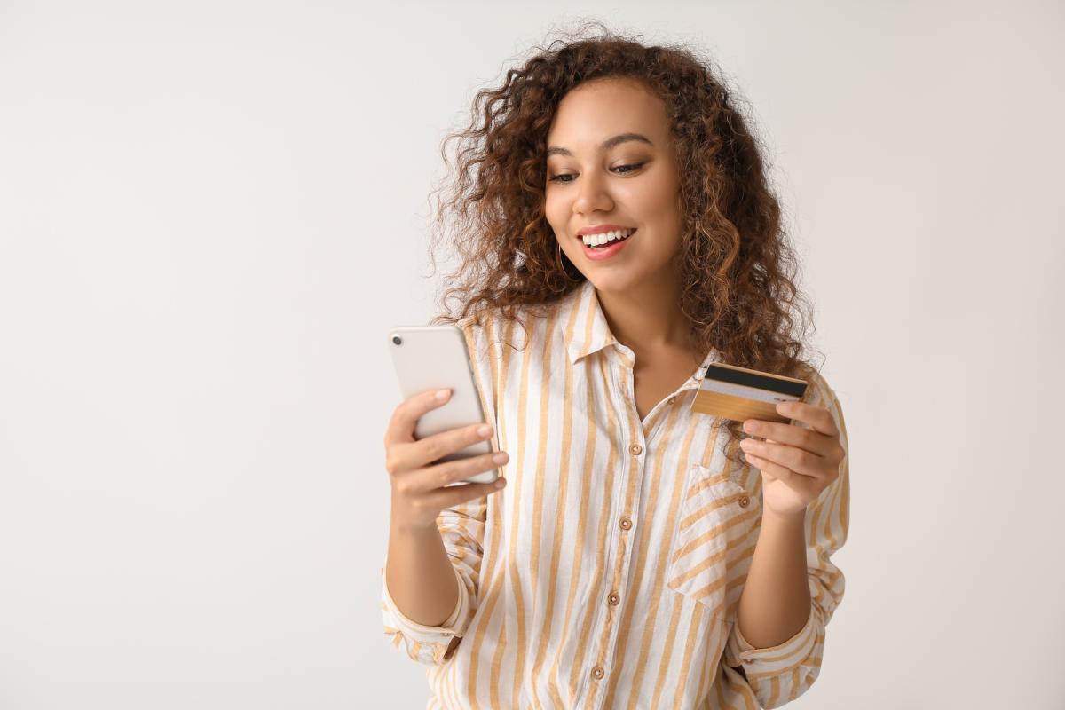 Woman with phone and card