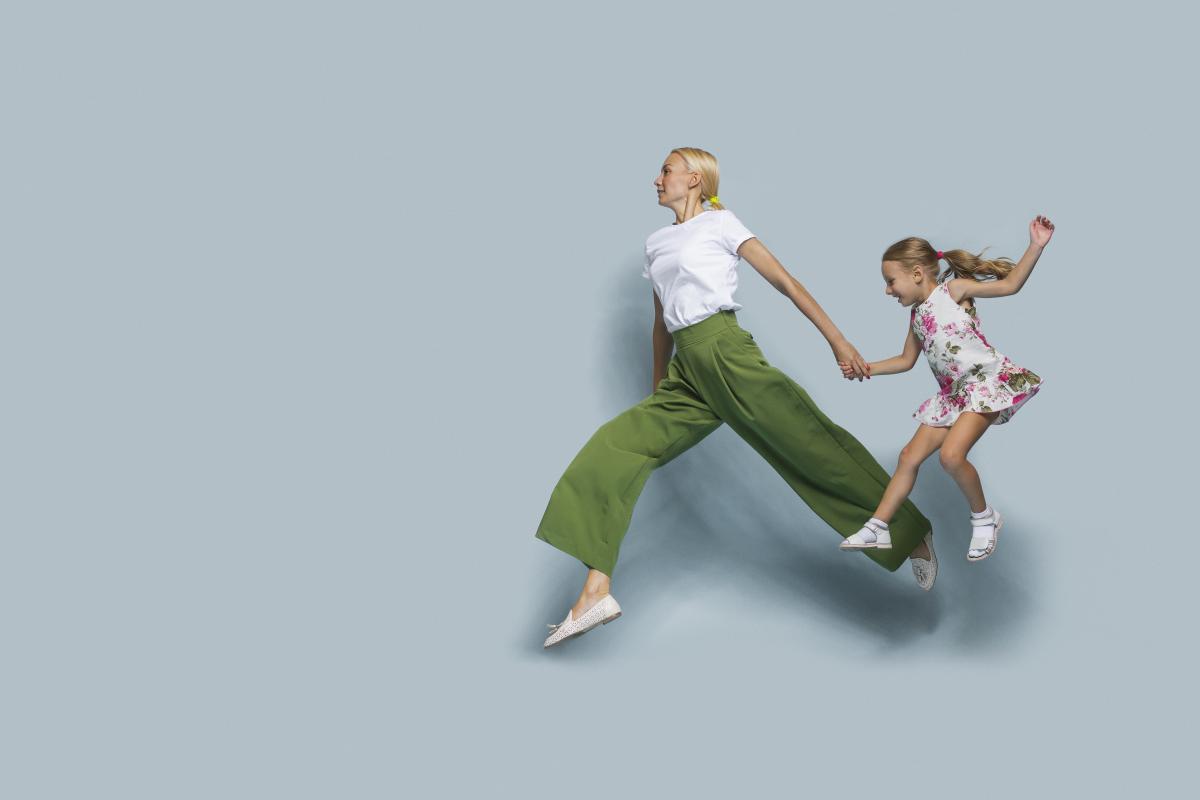 mother and daughter holding hands leaping