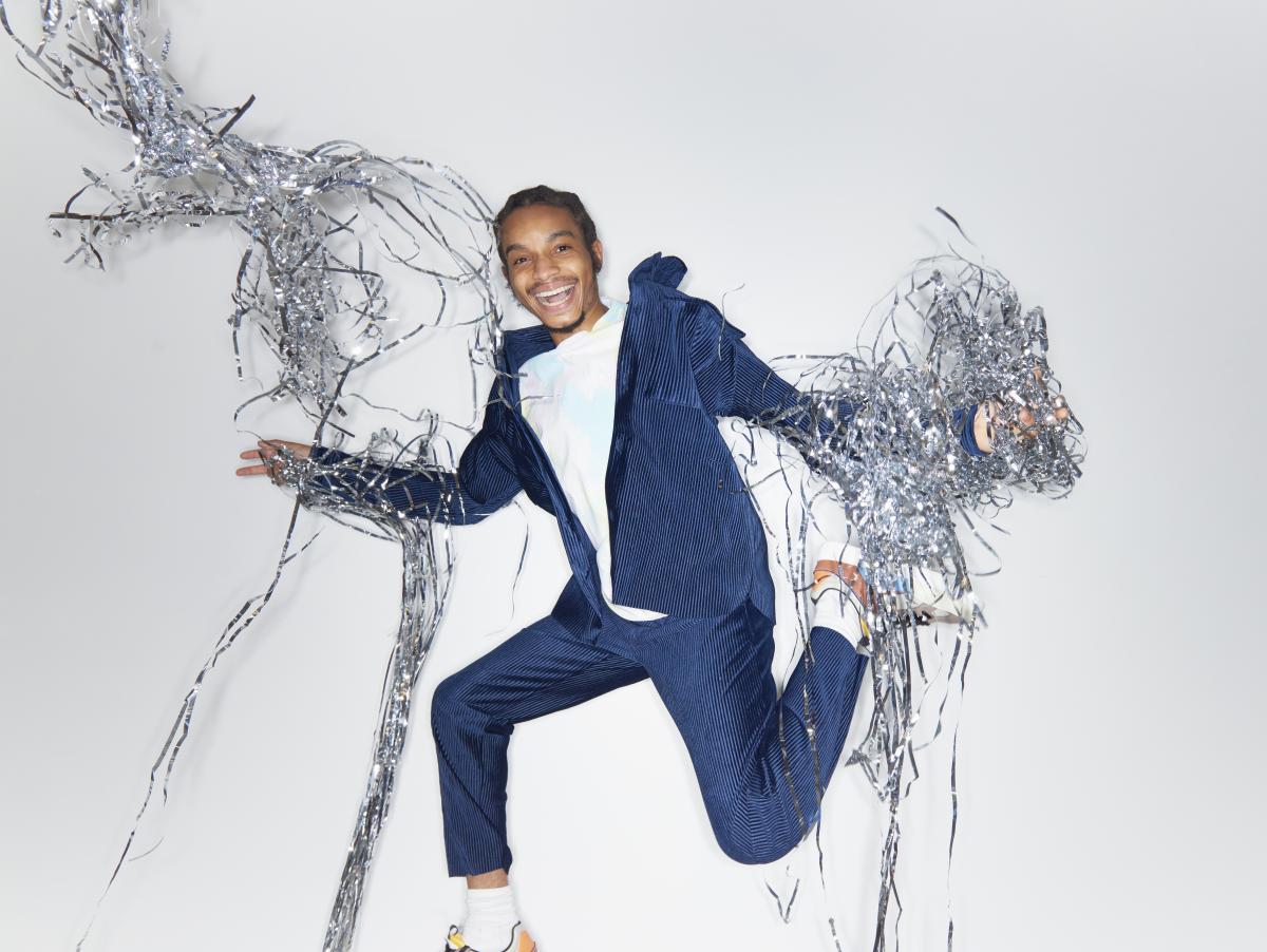 smiling man leaping with steamers falling all around