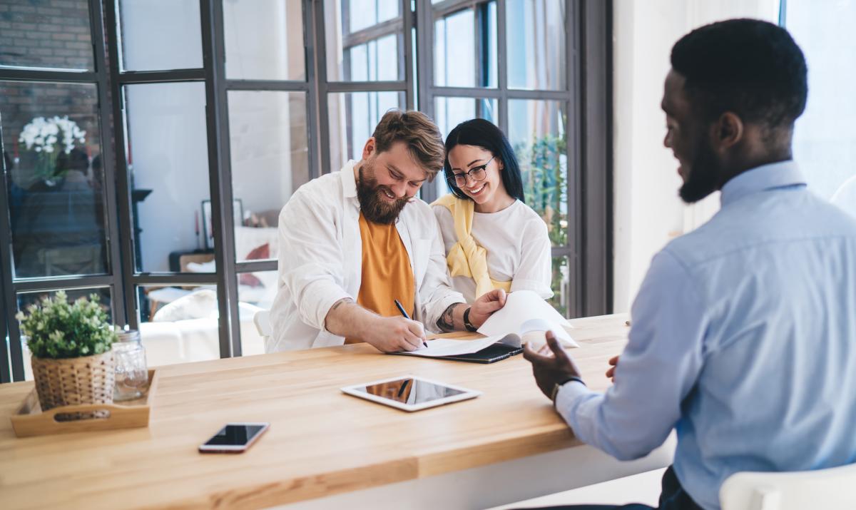happy couple signing paperwork for new purchase