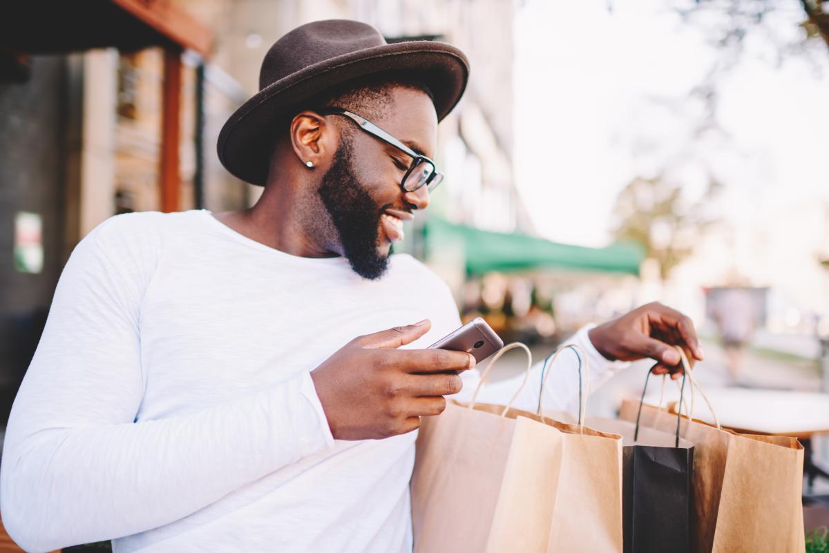 smiling man looking through shopping bags and using cell phone