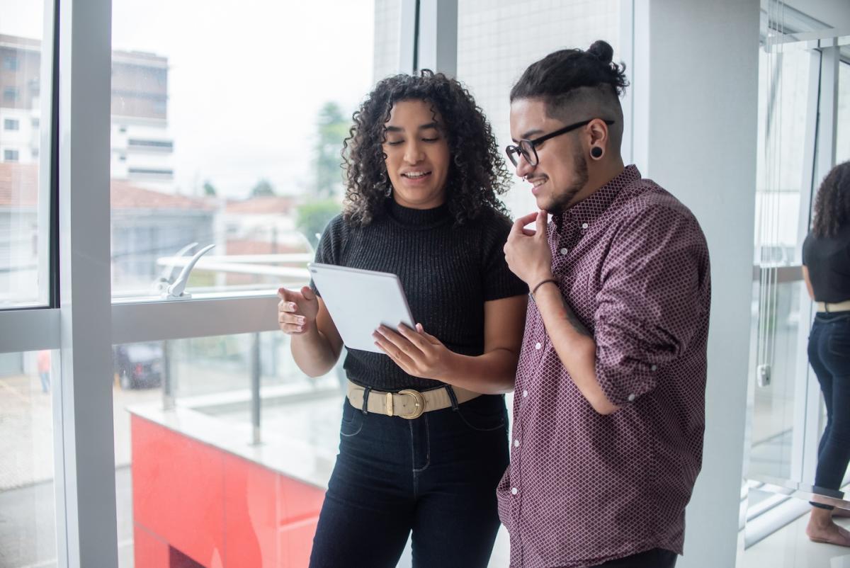 coworkers collaborating on tablet