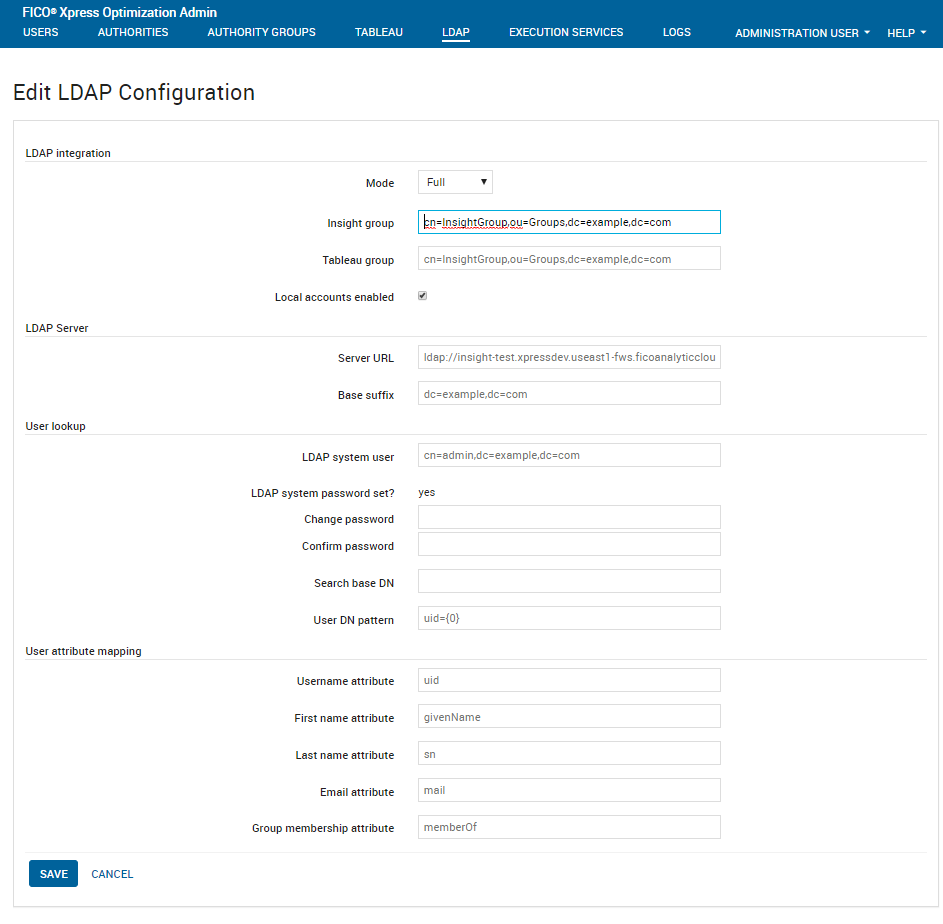 Last name attribute | Yes | This maps the Xpress Insight last name to the corresponding LDAP attribute within the user record. LDAP example: sn AD example: sn |