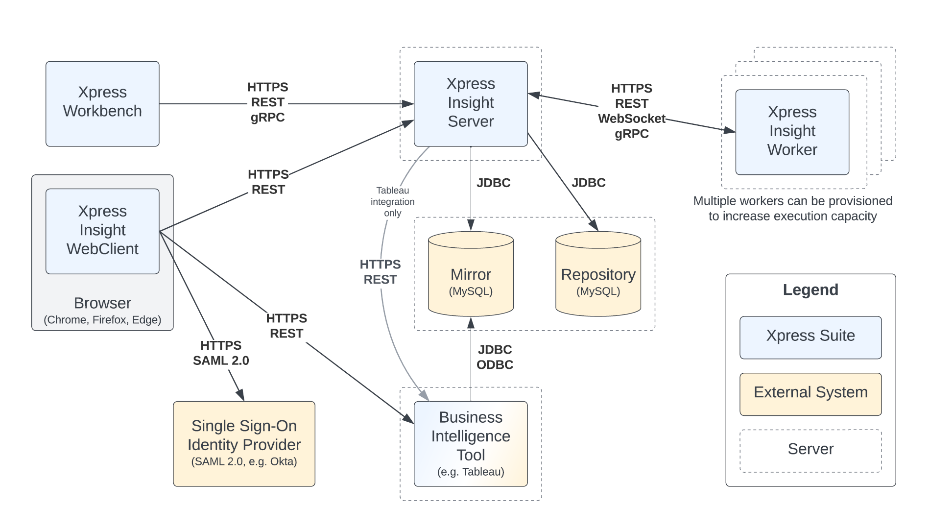 It is possible for all components of an Xpress Insight installation to run on the same machine. However, the figure depicts a more likely production configuration where the Insight server, Tableau server, the databases, and one or more execution workers are deployed on separate machines.
