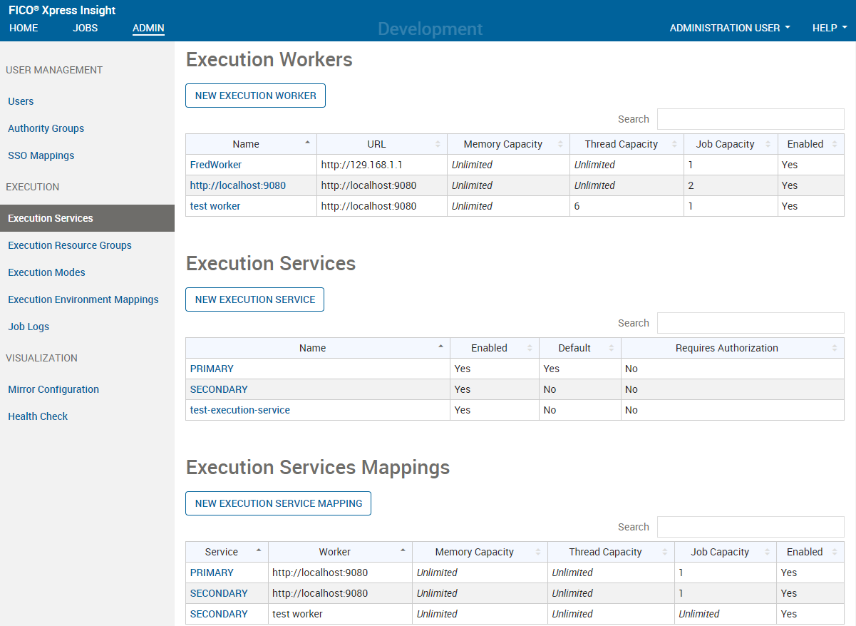 The page is divided into three sections: Execution Workers, Execution Services, and Execution Services Mappings.