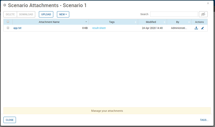 The vdl-action-attachment-manage defaults to operate with scenario level scope. The following example opens the Scenario Attachments dialog.