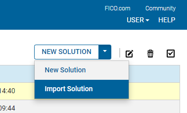 - In the Solutions page, click the down arrow in the NEW SOLUTION button and select Import Solution in the drop-down list.