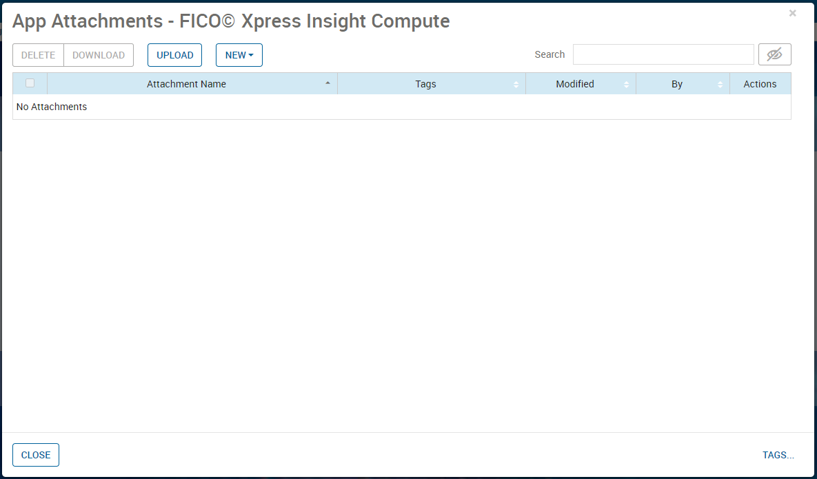 - Use the controls on the App Attachments window to UPLOAD or DELETE the available dependencies.