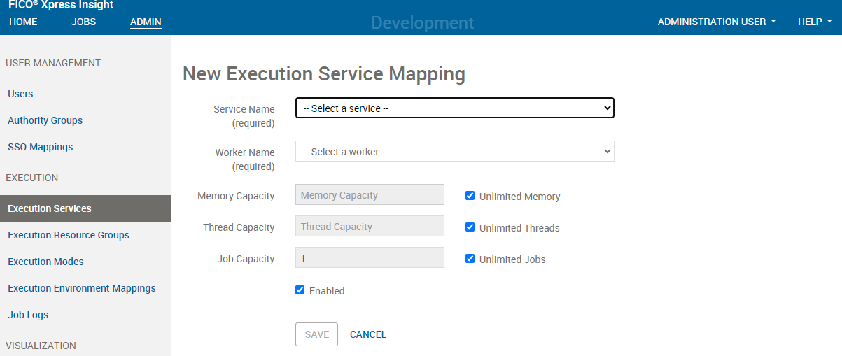 - In the Execution Service Mappings section of the Execution Services admin page, click NEW EXECUTION SERVICE MAPPING.