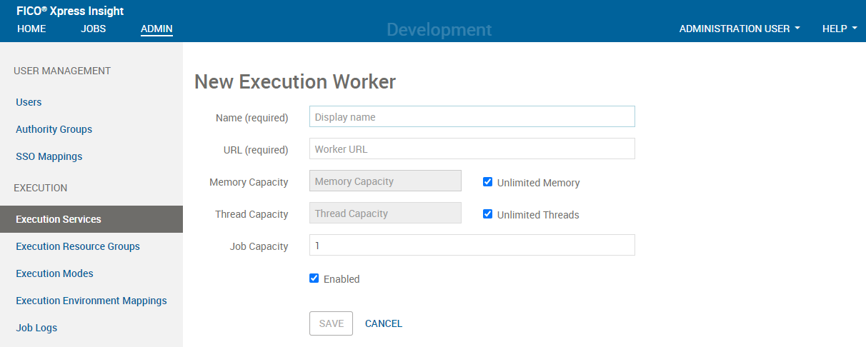 Note: Memory settings are read-only on FICO Analytic Cloud. The memory capacity of a worker is automatically calculated based on the total memory capacity of the machine. - Click SAVE when finished.
