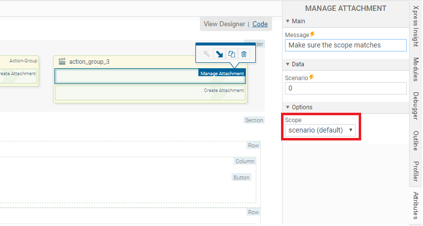 Note: Be careful to set the Options > Scope attribute in the Manage Attachment Action to match the scope defined for the other Actions in the group.