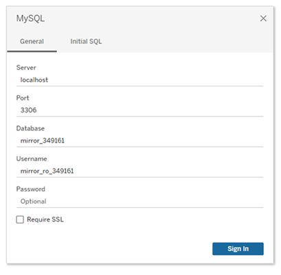 When developing a workbook the database host, port, schema name, username, and password that Tableau Desktop will use to connect to the Mirror database for the app must be supplied. These values, excluding the password, are then stored by Tableau Desktop within the workbook. Xpress Insight dynamically creates a Mirror database for each app. Therefore, the database connection values stored in the workbook itself are only applicable for the system the workbook was last authored against. An Insight system automatically overwrites these values when the app is deployed. Tableau Desktop cannot do this. If you wish to author an existing workbook that was not developed against your Insight development server then you will need to supply new connection values to Tableau Desktop.