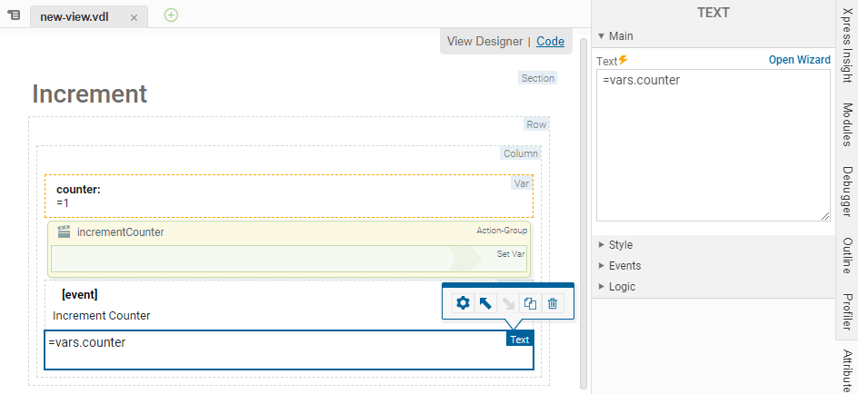 This example shows a VDL Action that increments a counter value, held in a vdl-var, by 1 each time a button is clicked—The button calls the increment.counter VDL Action group.