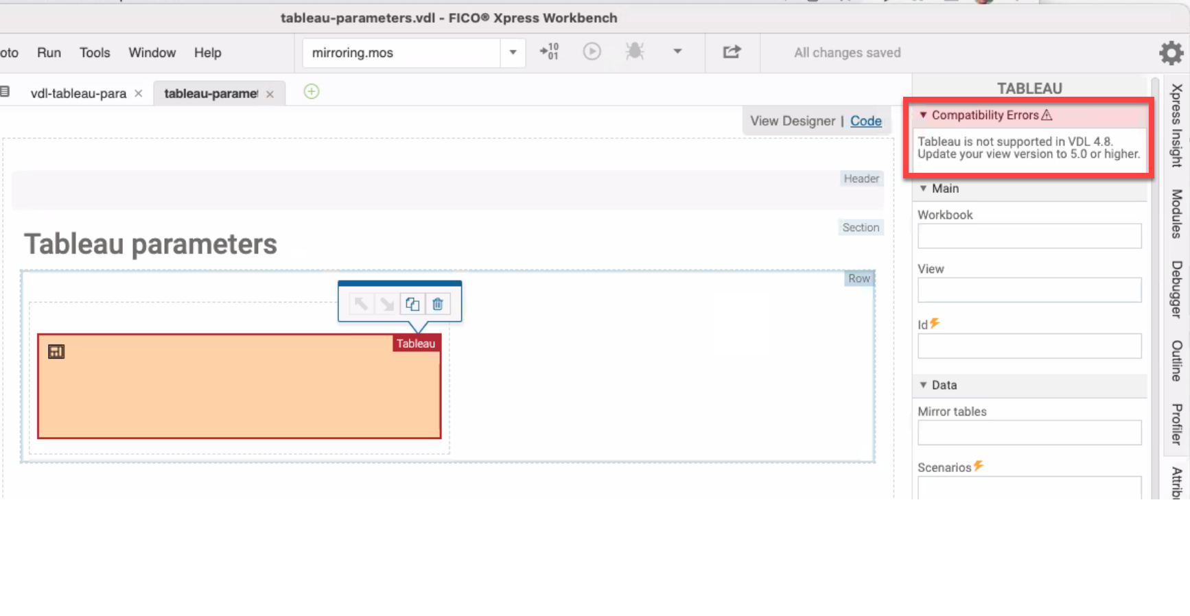 If you are using components in a view that require a newer version of VDL than is defined in the VDL file, View Designer shows a warning.