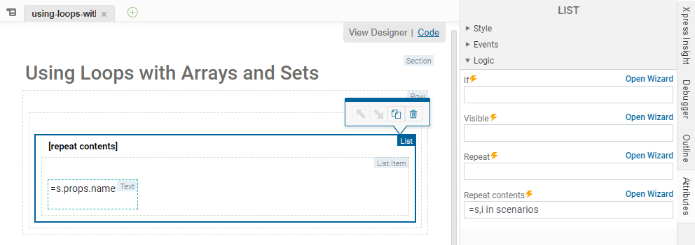 This example applies the vdl-repeat-contents attribute to a list item containing a text element which references the scenario name.