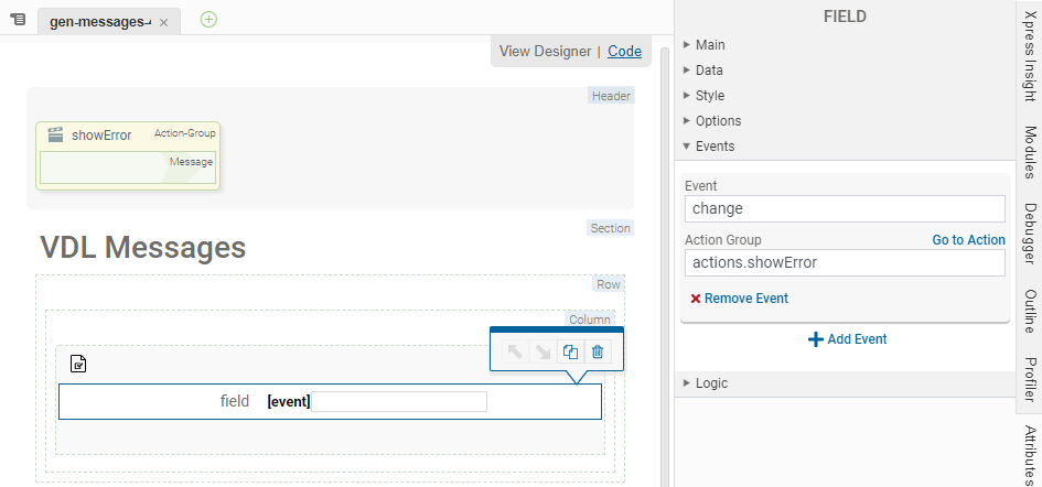 <vdl-field type="input" vdl-event="change:actions.showError"> </vdl-field>