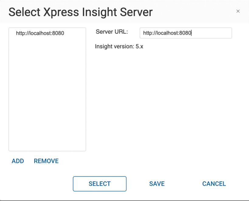 - To add a new server, use the ADD button under the left pane. If you are working locally and you have Xpress Insight installed on the same machine as Xpress Workbench, use the localhost server that displays in the list.