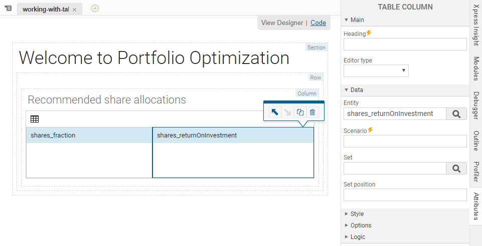 We can use a table to display columns based on the Shares_fraction and Shares_Return entities: