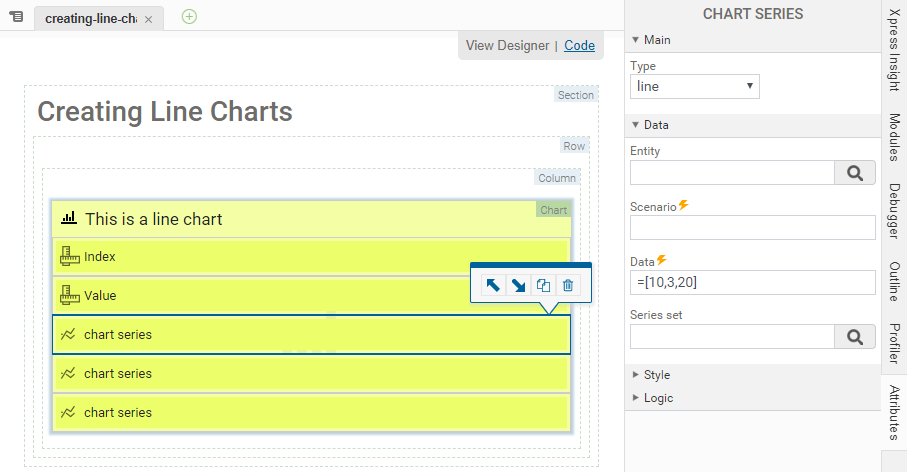 <vdl-chart-series data="=[10,3,20]" type=”line” labels="First">