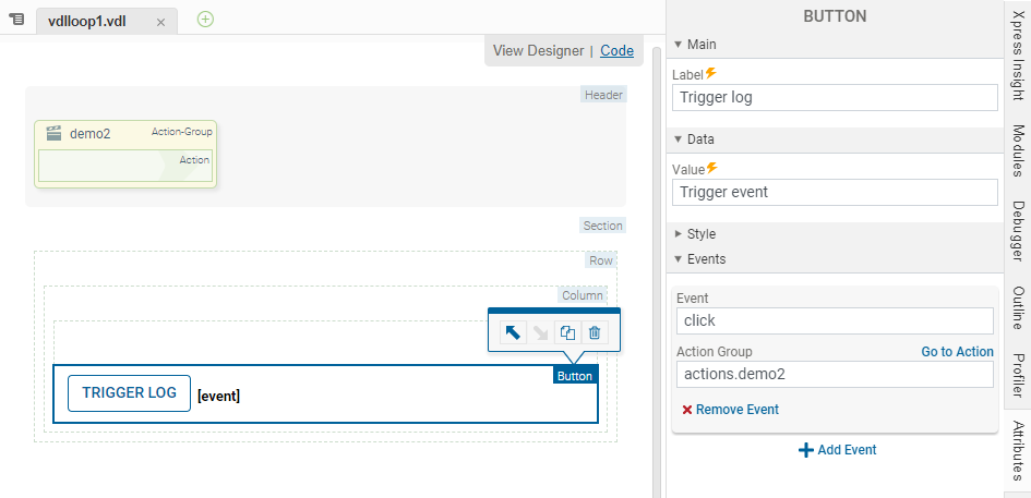 <vdl-button label="Trigger log" vdl-event="click: actions.demo2"></vdl-button>