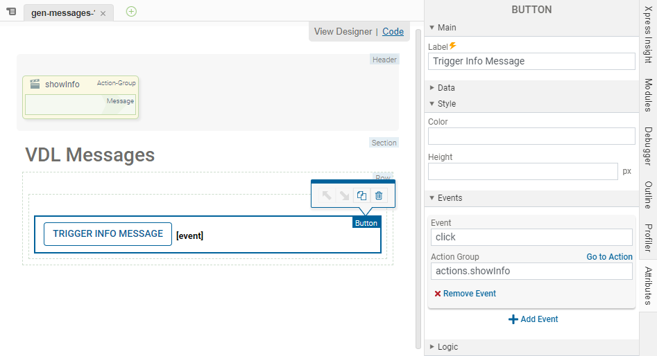 <vdl-button vdl-event="click:actions.showInfo" label="Trigger Info Message"></vdl-button>