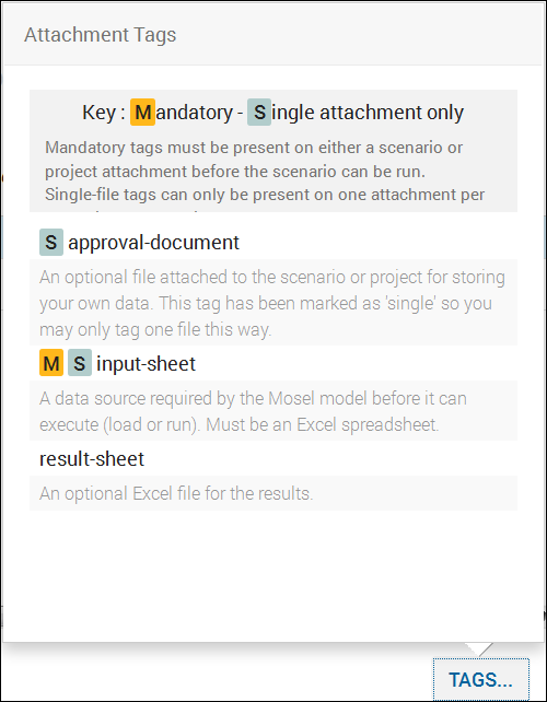 Attachments can be tagged with one or more tags, defined in an app, to identify them as being for a particular purpose to the Mosel model. Tags are assigned to files so that the system can use files based on their tags rather than requiring the actual filenames.