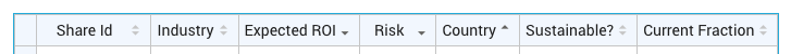 You can sort on multiple columns by clicking on the sort icon for the first column, and then clicking the additional columns while holding the Shift key. You can click each column multiple times (while holding the Shift key) to invert the sort order. This example shows the header of a table that is sorted on three columns: Expected ROI (descending), Risk (descending), and Country (ascending).