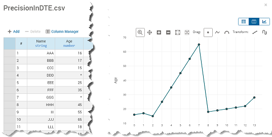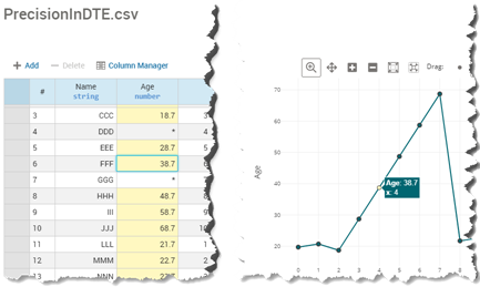 When dragging a selection in the chart editor, the precision on data displayed in in the table is increased by one decimal place to provide a finer degree of control. This precision is persisted when saving the data, and so will increase on each load for the same data. Therefore, each time you open the Decision Table Editor, edit the chart using drag mode, and close the Editor, you will increment the level of precision. The image below shows the values in the data table before and after the series has been dragged to a new position.