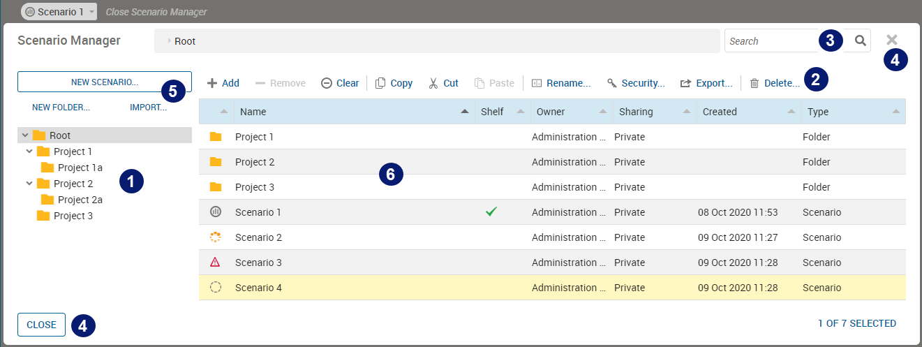 | 5 | Buttons used to create a scenario or folder, or to import an existing scenario or folder | ||||||||||