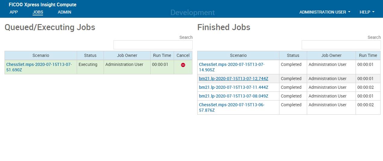 - The Finished Jobs pane shows jobs that have finished executing, along with the final status of each job. These jobs are sorted by most recent completion time.