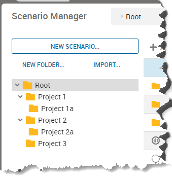 - The right hand pane updates whenever a folder is selected in the folder list to display the folder contents including all scenarios and any sub folders. The actions displayed at the top of the pane show which operations can be performed on an item selected in the right hand pane.
