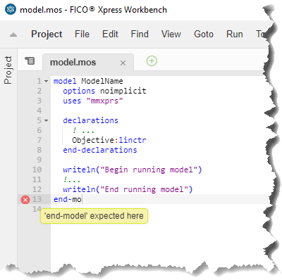 Xpress Workbench compiles the source file and any packages that it imports before running the model. Any syntax errors are highlighted in the code window, and compilation errors are displayed in the Output window. Packages can be compiled but not run, as a debugging step.