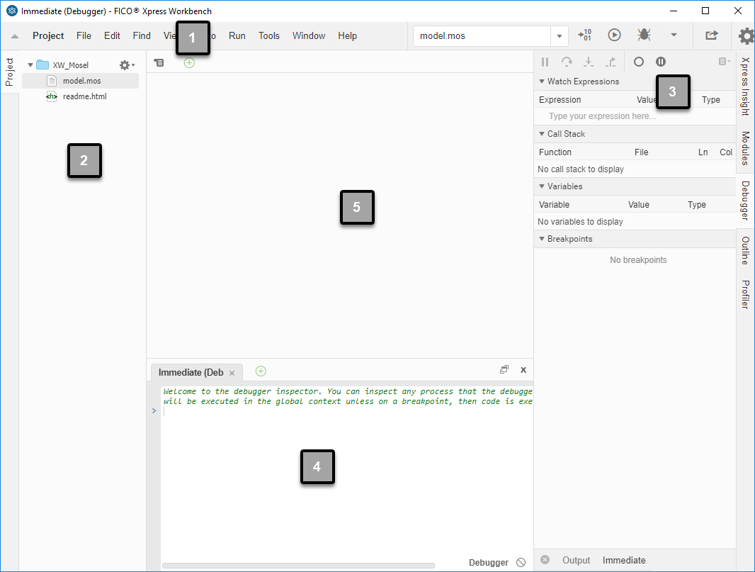 The Xpress Workbench Integrated Development Environment contains five major panels.